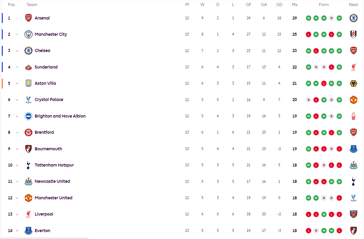 北京时间11月30日,2025-26赛季英超第13轮先赛几场,积分榜情况如下:
